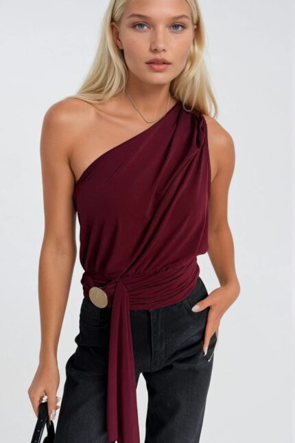 Aksesuar Detay Tek Omuz Bağlamalı Bordo Bluz