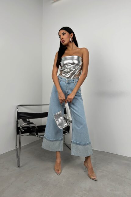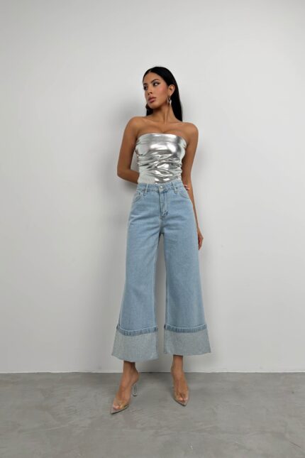 Paçası Taş Detaylı, Yüksek Bel, Bol Paça, Katlamalı Görünümlü Paça Jean Manken Ölçüleri : Göğüs : 89 cm Bel :