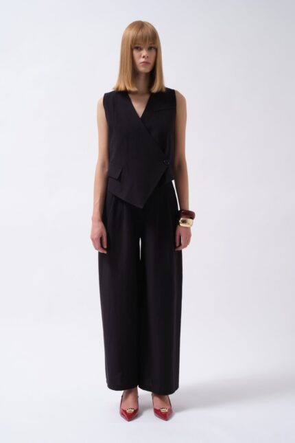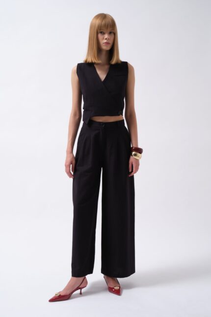 Pileli Geniş Paça Keten Siyah Pantolon