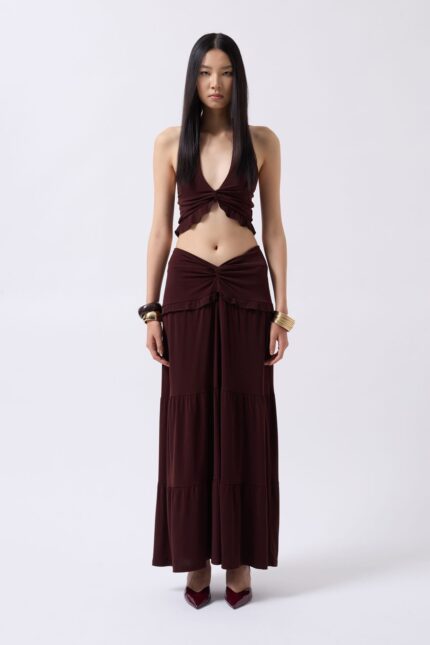 Büzgü Detay Asimetrik Bel Kahverengi Etek