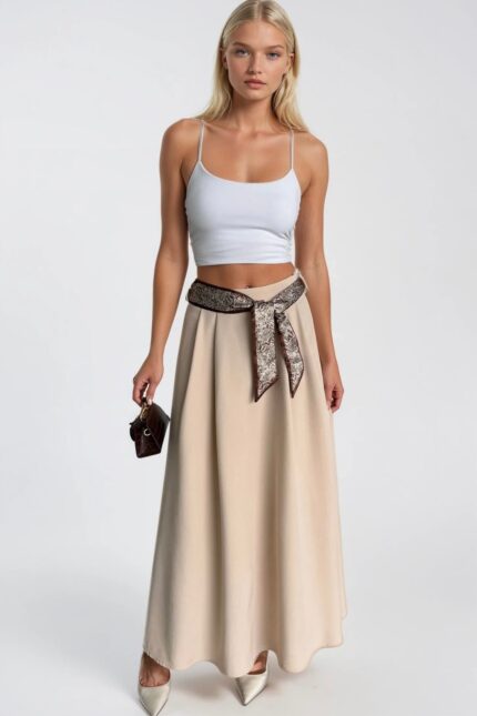 Toprak tonlarının zarafeti, dokuma dokusuyla buluşuyor. Fular detay maxi bej dokuma etek, sofistike gardırobunuzun en şık parçası. Tasarım Detayları Özel