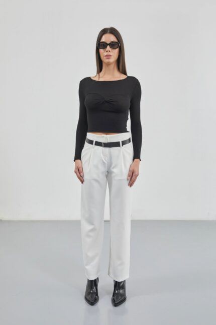 Detajet e rripit Pantallona të bardha me bel të lartë