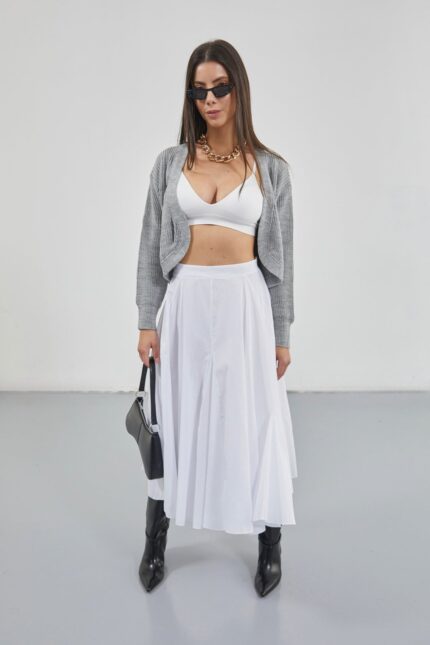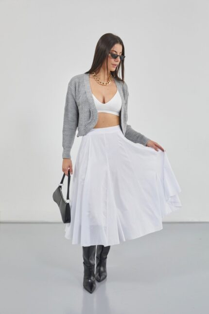 Gizli Fermuarlı, Etek Boyunda Astarlı, Kat Kesimli, Midi Boy Kloş Etek Manken Ölçüleri : Göğüs : 80 cm Bel :