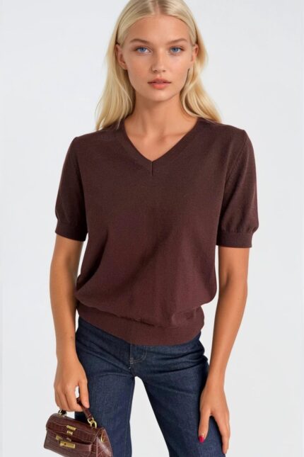 Klasik ve sofistike tasarımıyla dikkat çeken V Yaka Kısa Kol Kahverengi Triko Bluz, kombinlerinize sıcak ve şık bir hava katan