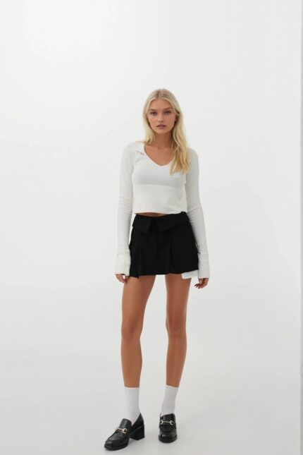 V Yaka Korsaj Detay Ekru Triko Bluz