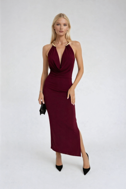 Tutkunun Zarif SilüetiDegaje yakanın zarif açıklığını aksesuar detayının özgün karakteriyle buluşturan bu bordo maxi elbise, rengin derin tutkuşunu sofistike bir