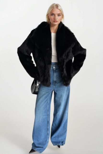 Şal Yaka Peluş Siyah Kürk