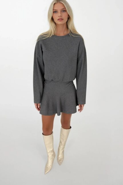Bisiklet Yaka Bel Oturtmalı Gri Elbise