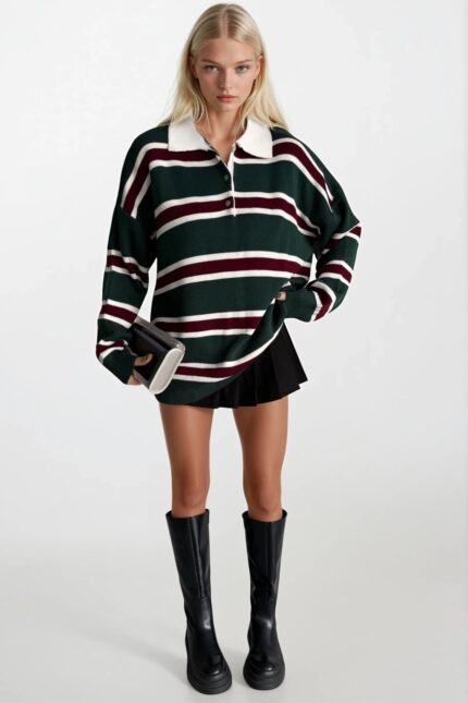 Çizgili Düğmeli Polo Yaka Yeşil Triko Bluz