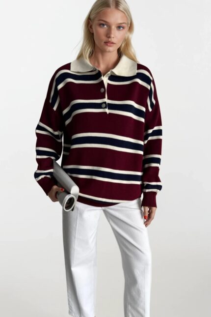 Çizgili Düğmeli Polo Yaka Bordo Triko Bluz