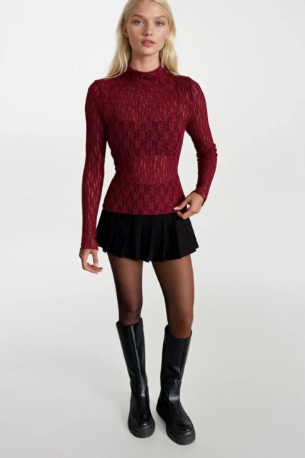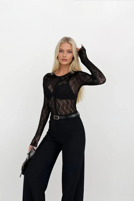 Dantelli Düğmeli Siyah Bisiklet Yaka Bluz
