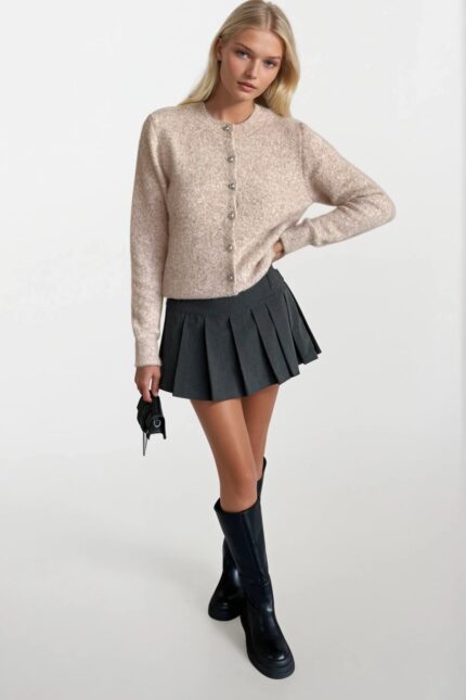 Şıklığın ve Konforun Buluştuğu Triko Takım Düğme detaylı bel oturtmalı haki triko takımımız, modern kadının gardırobunda olmazsa olmaz parçalardan biri.