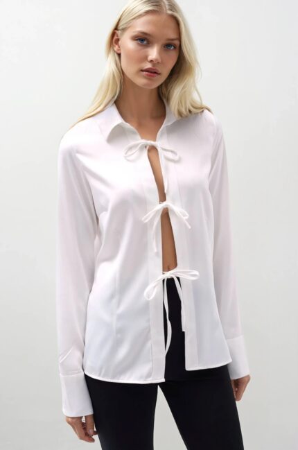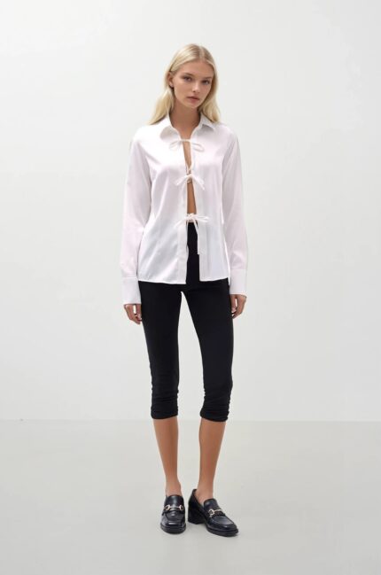 Bağlama Detay Saten Beyaz Gömlek