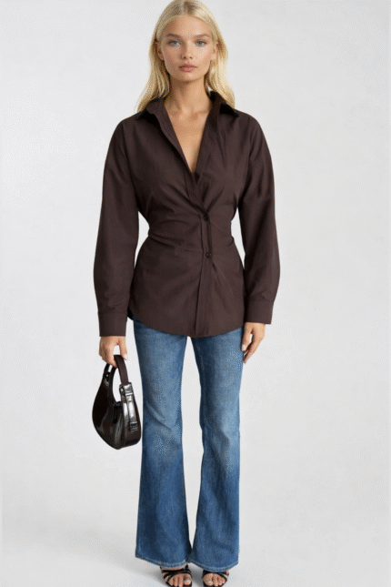 Asimetrik Düğme Detay Bel Oturtmalı Kahverengi Gömlek