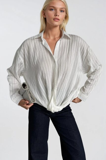 Saf beyazın temiz zarafeti, premium modal dokusuyla buluşuyor. Bel büzgülü dokulu beyaz modal gömlek, minimalist gardırobunuzun en çok yönlü parçası.