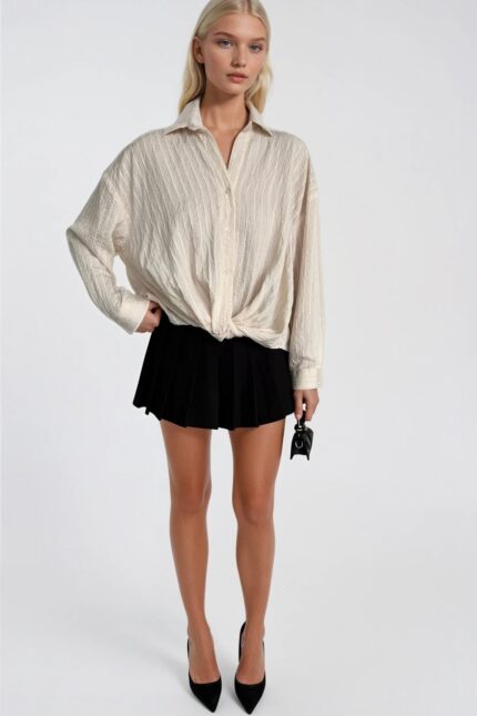 Bel Büzgülü Dokulu Beyaz Modal Gömlek