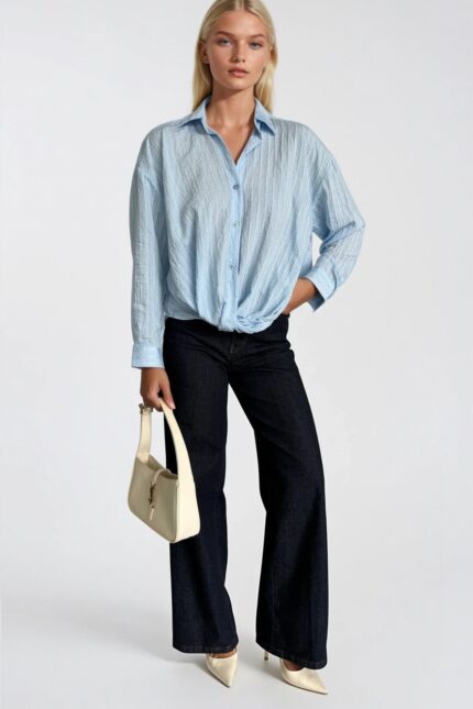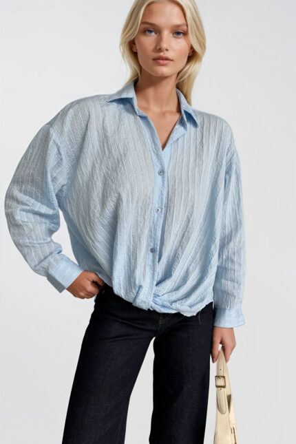 Bel Büzgülü Dokulu Mavi Modal Gömlek