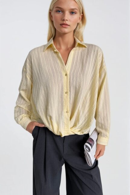 Bel Büzgülü Dokulu Sarı Modal Gömlek