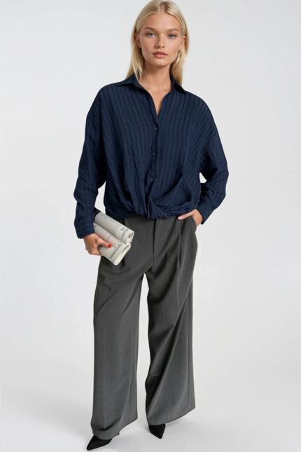 Bel Büzgülü Dokulu Lacivert Modal Gömlek