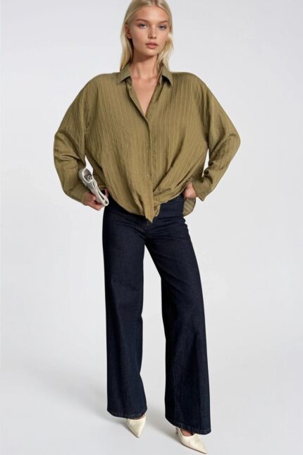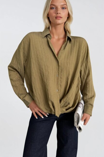 Bel Büzgülü Dokulu Haki Modal Gömlek
