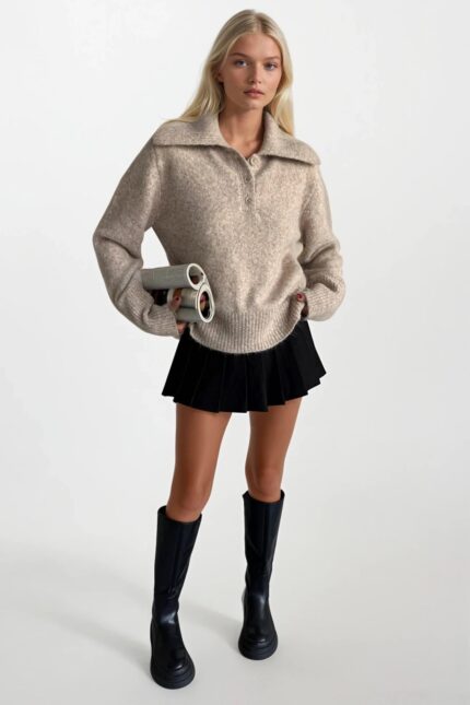 Polo Yaka Bej Düğmeli Triko Kazak