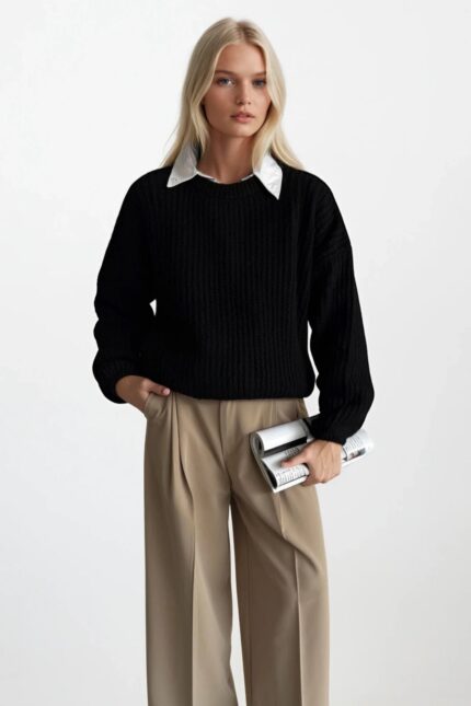 Örgü Detay Basic Siyah Triko Kazak