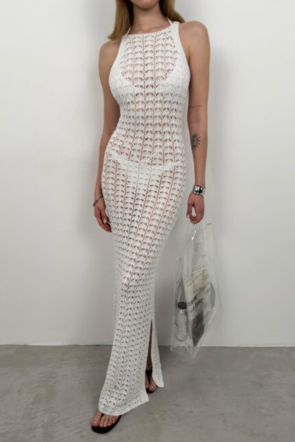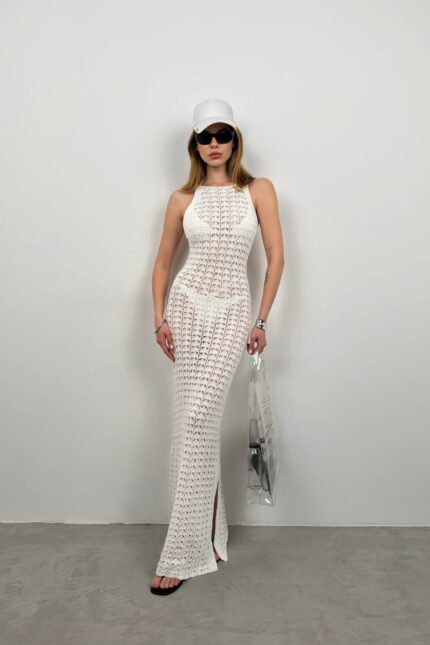 Fustan maxi i bardhë me detaje prerjeje dhe dizajn ajur