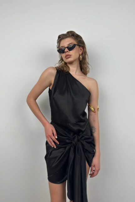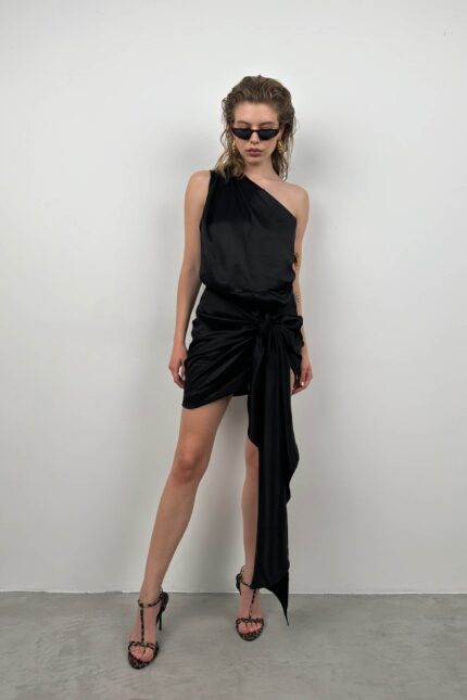 Tek Omuz, Asimetrik Görünüm, Kumaş Kuşak Kemer Bağlamalı, Saten, Mini Elbise Manken Ölçüleri : Göğüs : 85 cm Bel :