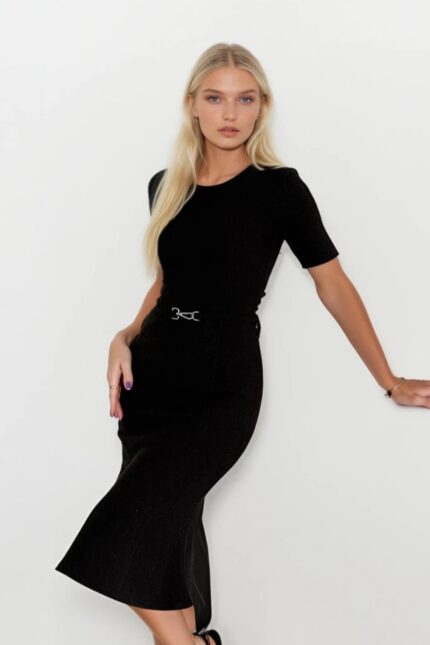 Taş Detay Dokulu Siyah Elbise