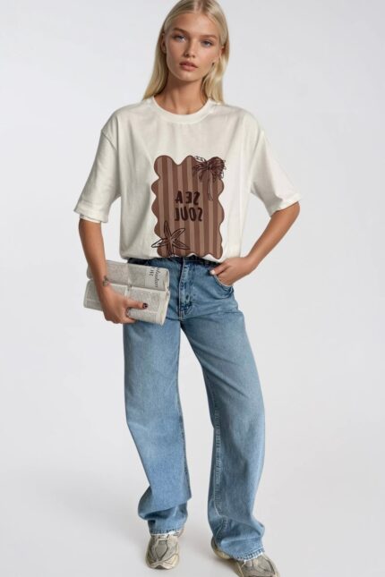 Denizin özgür ruhunu taşıyan modern tasarım. Sea Soul baskılı oversize beyaz t-shirt, gardırobunuza huzur ve özgünlük katıyor. Tasarım Detayları İlham