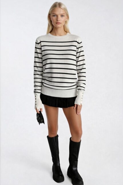 Çizgili Bisiklet Yaka Düğme Detay Beyaz Triko Bluz