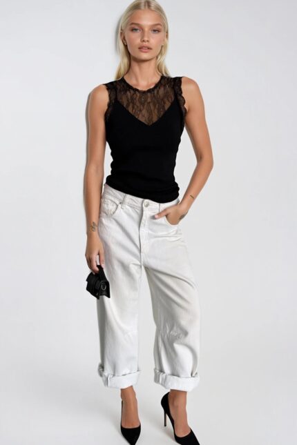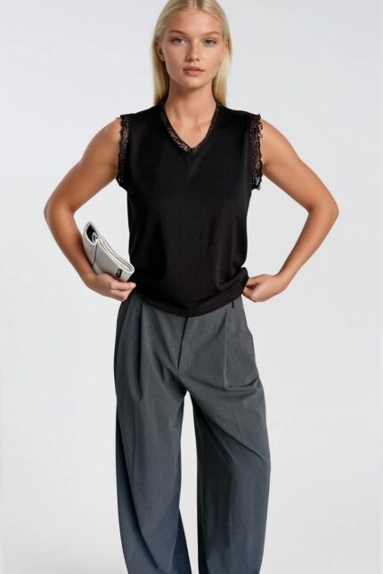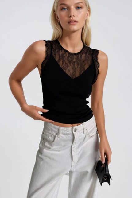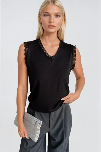 Dantel Detay Kolsuz Siyah Triko Bluz