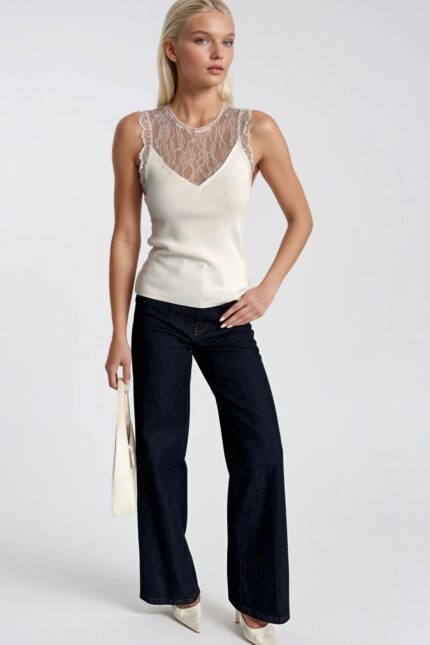Triko’nun Sıcaklığı, Dantel’in İnceliği Triko’nun kucaklayıcı dokusu ile dantel garnişin zarif dokunusu bir arada. Bu beyaz bluz, gündelik konforu özel