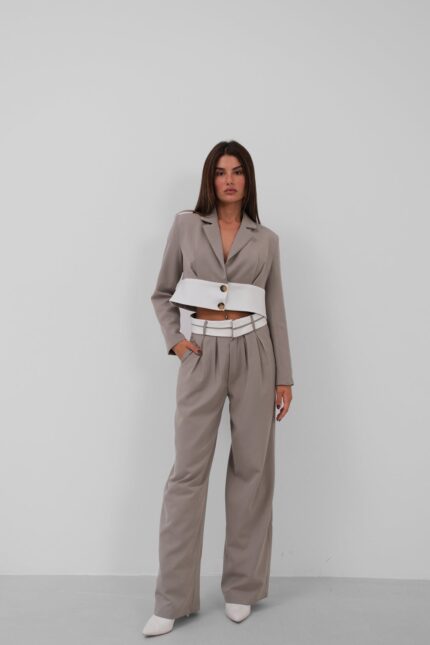 Bağlamalı Ekru Crop Ceket Pantolon Takım