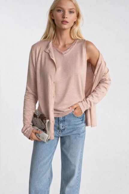 Feminen enerjinin en taze hali.Düğme Detay İnce Bluz & V Yaka Dantel Bluz İkili Pembe Triko Takım, pembenin canlı ve