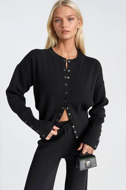Sofistike ve şık tasarımıyla dikkat çeken Düğme Detay Bel Oturtmalı Triko Bluz Pantolon Siyah İkili Takım, her ortamda şık görünmenizi