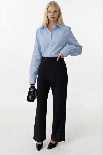 Pantallona të zeza asimetrike me detaje mbështjellëse