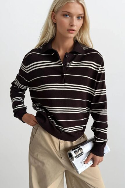 Çizgili Polo Yaka Kahverengi Bluz