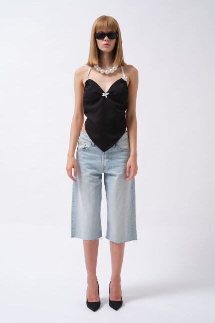 Ön Büzgü Detay Sirt Baglamali Siyah Bluz