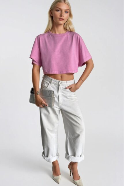 Yıkama Efektli Pembe Crop Tişört