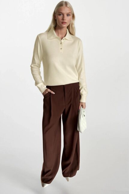Polo Yaka Düğme Detay Kahverengi Çizgili Triko Kazak