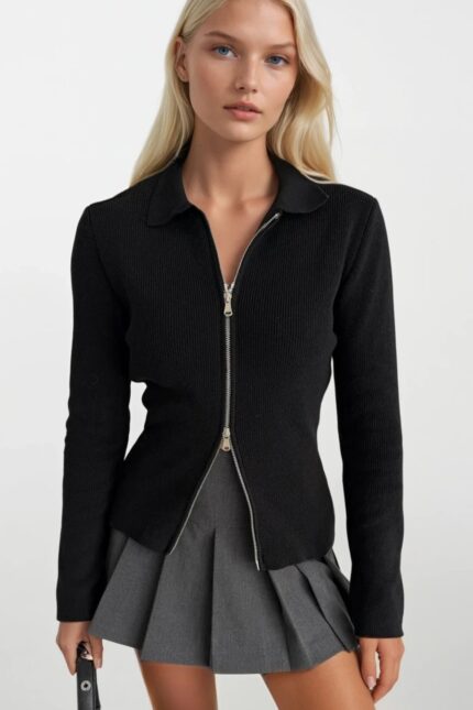 Polo Yaka Çift Fermuarlı Siyah Triko Bluz