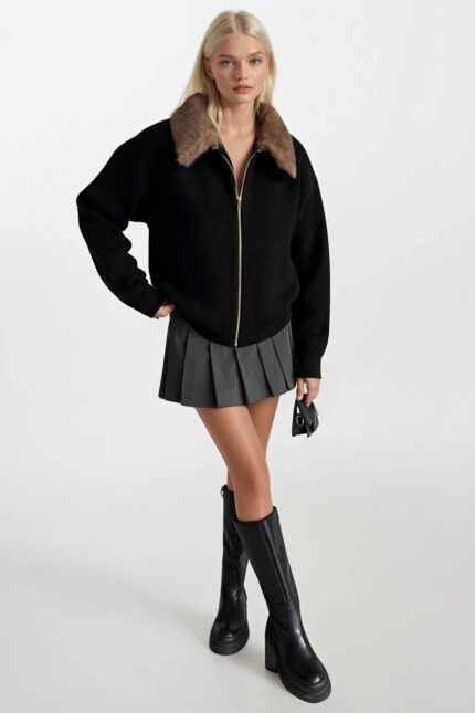 Yaka Kürk Detay Fermuarlı Siyah Triko Kazak