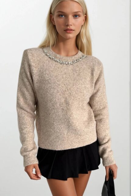 Yaka Taş İşlemeli Ekru Triko Kazak