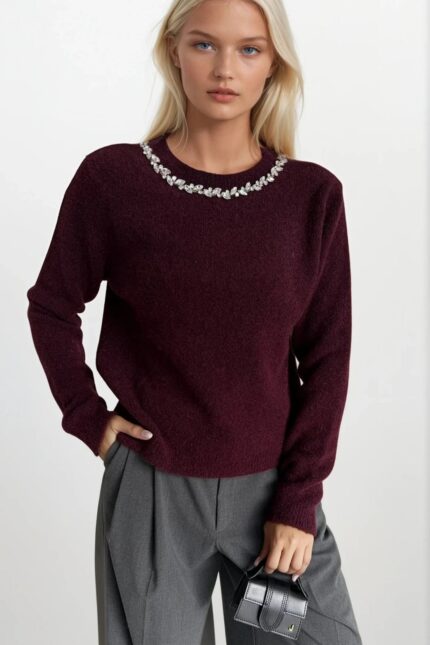 Yaka Taş İşlemeli Bordo Triko Kazak