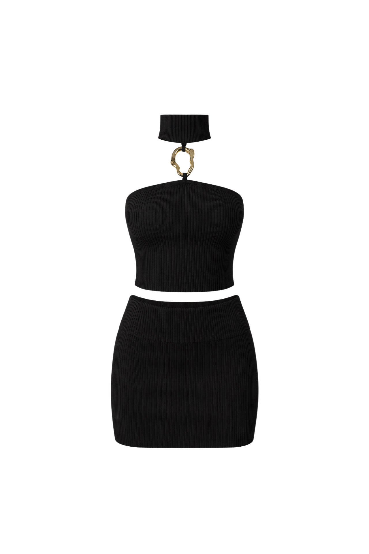 Aksesuar Detay Balıkçı Yaka Bluz Katlamalı Mini Etek İkili Siyah Triko Takım