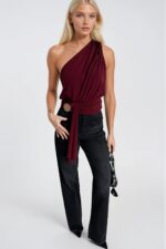 Aksesuar Detay Tek Omuz Bağlamalı Bordo Bluz