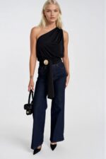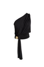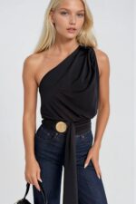 Aksesuar Detay Tek Omuz Bağlamalı Siyah Bluz