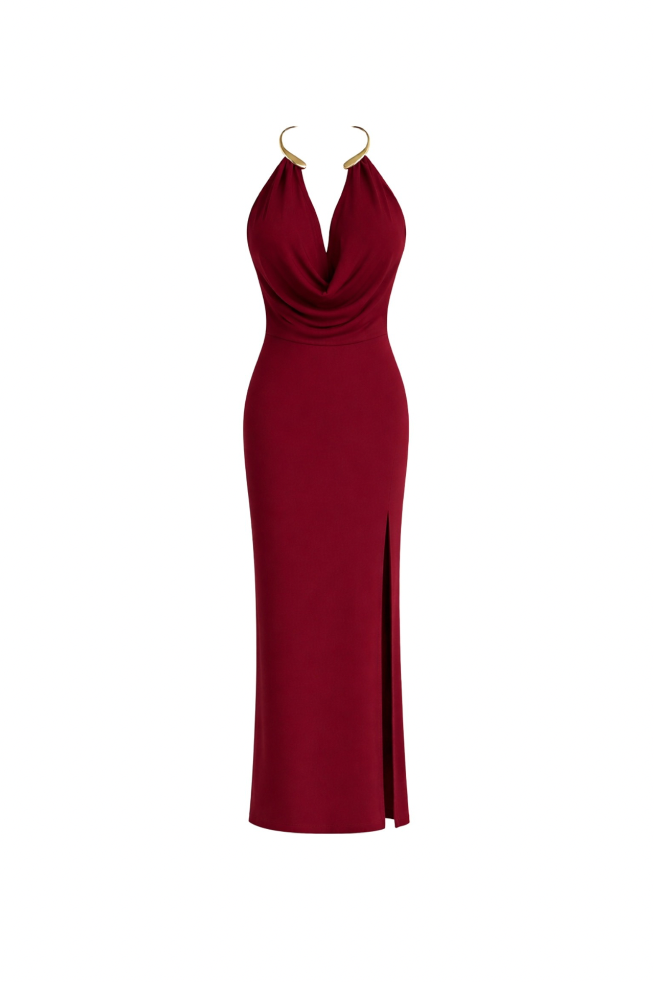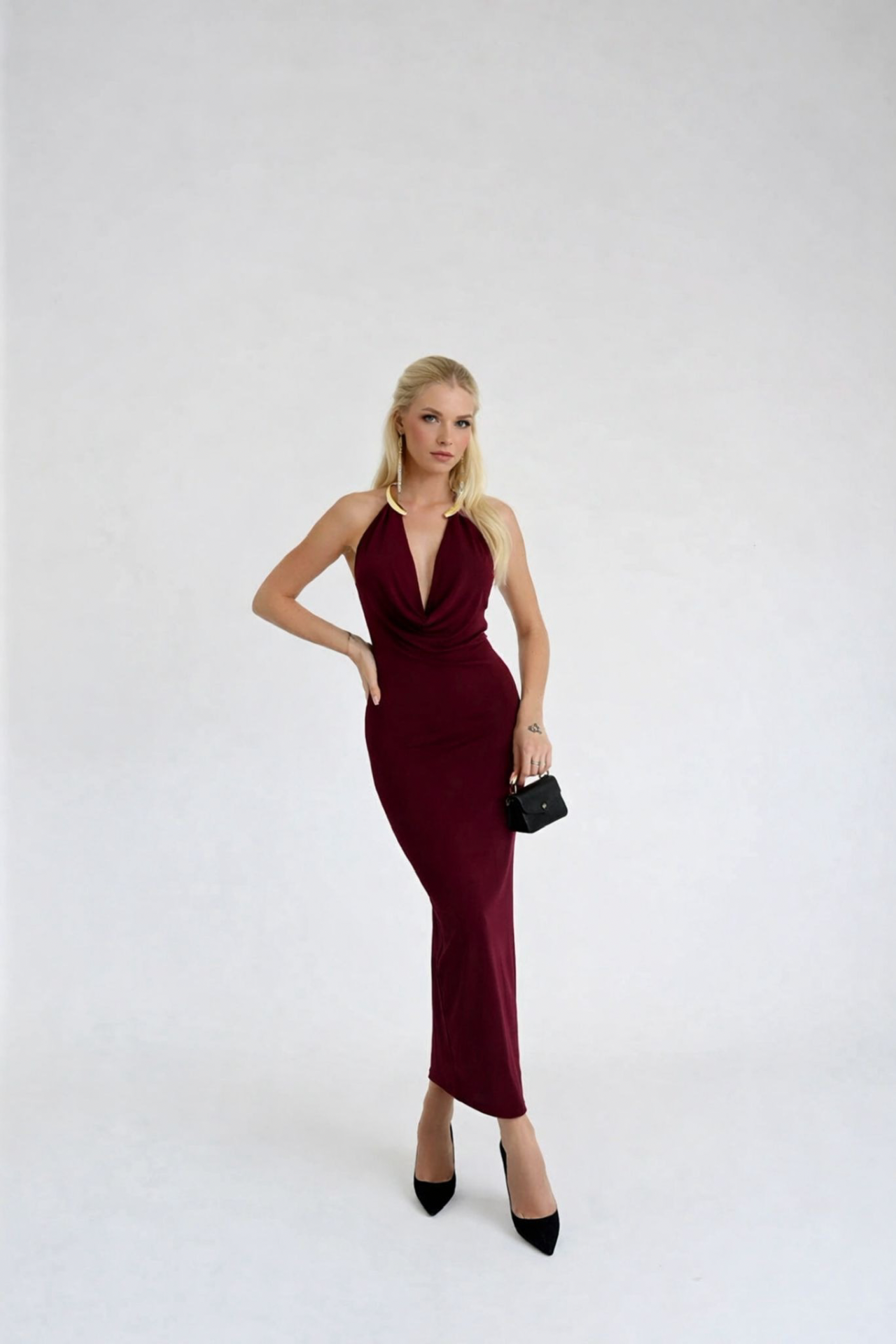 Aksesuar Detaylı Degaje Yaka Bordo Maxi Elbise