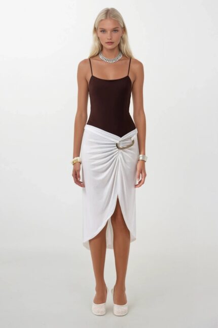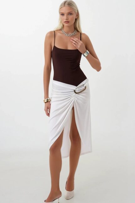 Toprak Tonunun Zarif AkışıDegaje yakanın zarif açıklığını aksesuar detayının özgün karakteriyle buluşturan bu kahverengi maxi elbise, toprak tonunun doğal sıcaklığını sofistike bir silüete taşıyor. Maxi kesimin akışkan yapısı ve kahverengi’nin özgün derinliği, bu elbiseyi özel davetlerden şık akşam yemeklerine uzanan geniş bir kullanım alanına taşıyor.Tasarım Detayları Degaje yaka — omuzları ve décolletéyi zarif bir çerçeveye alan, feminen ve sofistike bir kesim Aksesuar detayı — tasarıma özgünlük ve karakter katan öne çıkan bir unsur Maxi boy — akışkan ve zarif bir silüet Sıcak kahverengi ton — doğal, sofistike ve toprak paleti ile mükemmel uyum S, M ve L beden seçeneği Nasıl Kombinlenir?Krem ya da altın tonlu ince topuklu bir sandaletle toprak paleti üzerinden bütünlüklü bir görünüm elde edin; ya da siyah stiletto ile güçlü bir kontrast kurun. Minimal altın ya da bronz aksesuar seçimleri kahverengi’nin doğal sıcaklığını en iyi şekilde öne çıkarıyor.Ürün Kodu: 52125030